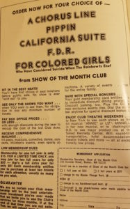 | This ad for Show of the Month Club was in the Dracula Playbill. A one year, $15 membership got you the opportunity to buy the best seats for whatever shows were coming up as well as a chance to attend the theater weekend to go see Annie or Liza Minnelli. Fifteen dollars! |