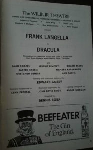 I was eight and a half years old that summer and thanks to the helpful comments of a neighbor (“My mother said your mother’s brain exploded!”) I was convinced my mother was going to die. She thankfully didn’t, but her recovery was long, painful, and frustrating. She had only been back home from the hospital for a few days when my grandparents decided it was time to give her a break from me and my older sister. We were told to get dressed up and before we knew it my grandparents were driving us into Boston to go see a play. My parents met working in the theaters in Boston. My grandmother was the first woman theater manager in the country. My grandfather, uncles, aunts, and cousins, all worked in the theaters at some time or another in the 50’s, 60’s, 70’s and 80’s (as did my sister and I for a time in the 70’s and 80’s). I knew what the theater was and that it was important in our family and had visited a few times when other people were working, but I had never actually been to a show. Under any other circumstances, I would have been thrilled. But my mother had been in the hospital about a month and neither my sister nor I were very happy about leaving her, even if only for a few hours. So I think my sour mood (and the years…Jesus it’ll be 40 years this year!) has made me forget most of the experience. I remember how dark everything was. Not just the theater itself but the stage. And I remember there being a couch on stage and after the show we were allowed to stick around and someone showed us that there was a trap door in the floor behind the couch (which is how Dracula appeared and disappeared so quickly during the performance).